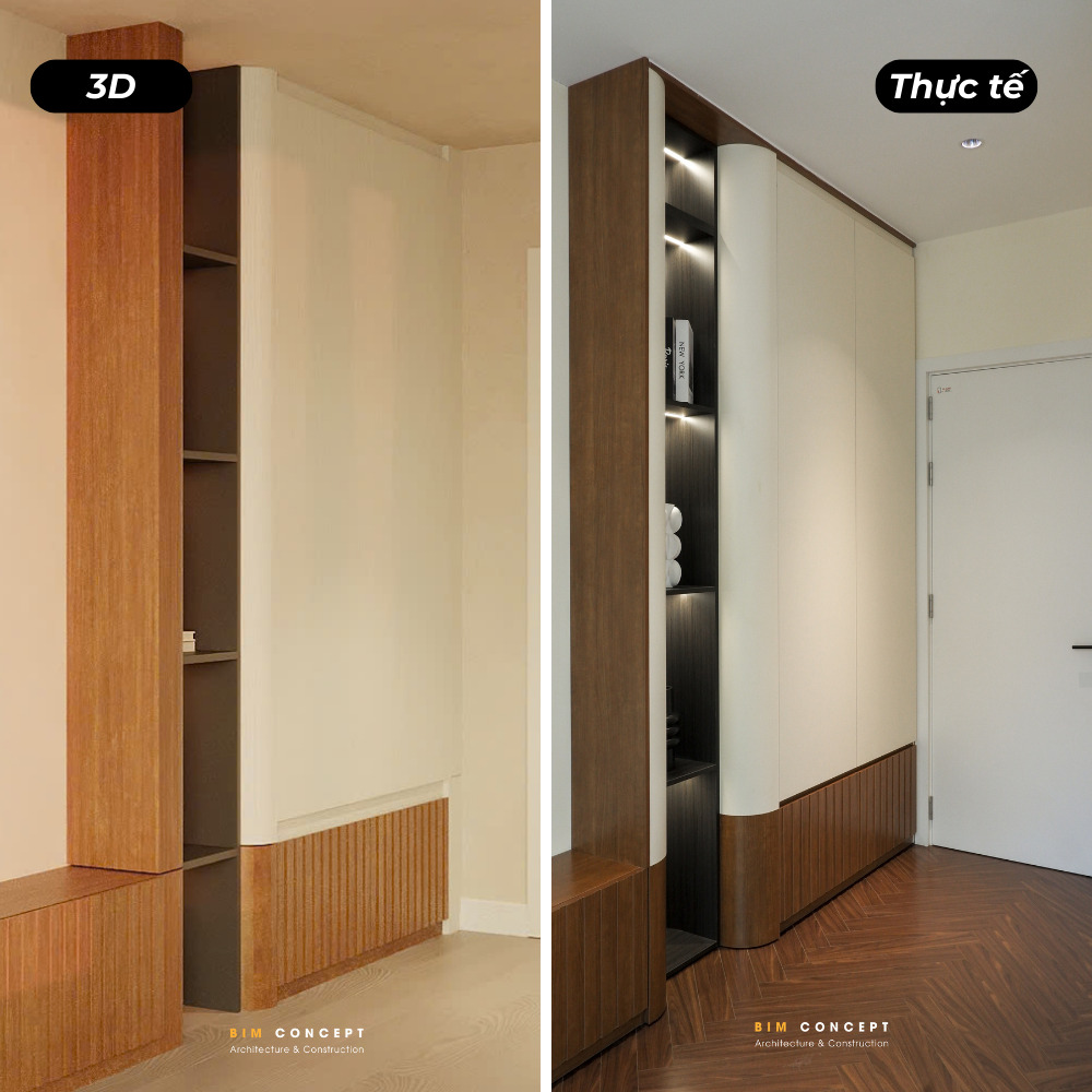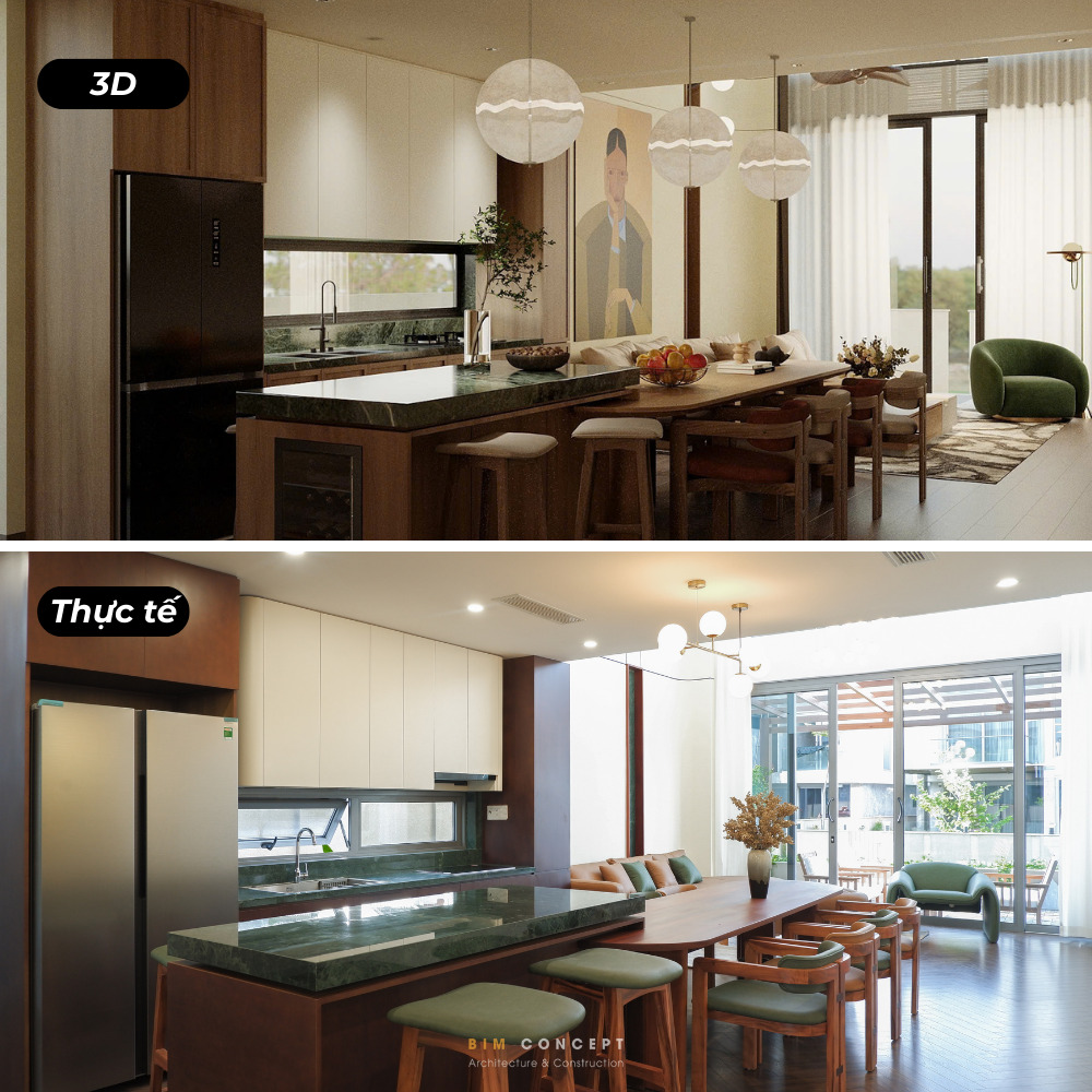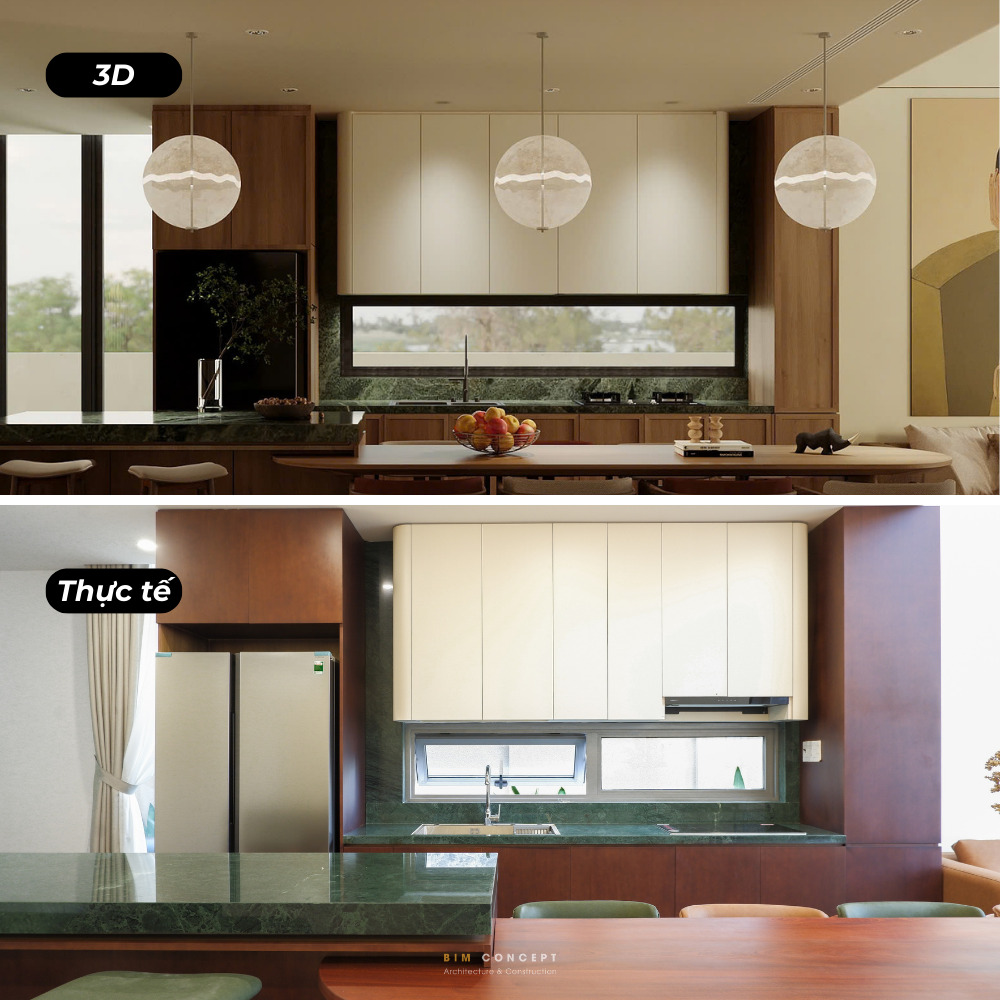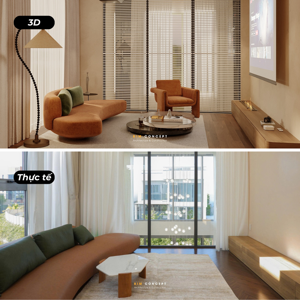 Để khách hàng có cái nhìn rõ ràng hơn về chất lượng thi công, Bim Concept luôn ghi lại hình ảnh thực tế sau khi hoàn thiện. Những bức ảnh này được đặt cạnh bản vẽ 3D để dễ dàng so sánh. Qua đó, khách hàng có thể thấy rõ mức độ giống nhau giữa thiết kế và công trình thực tế.