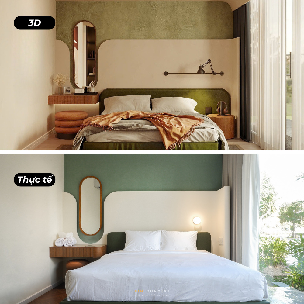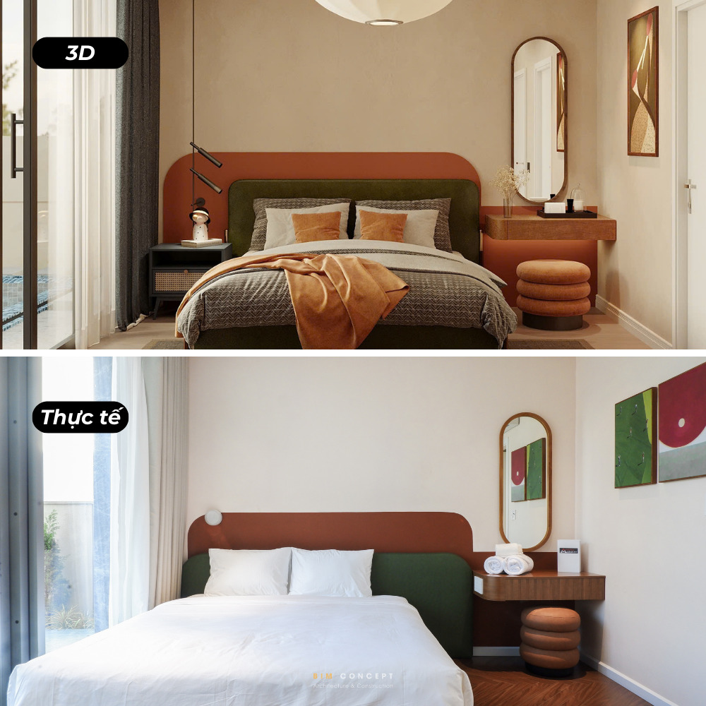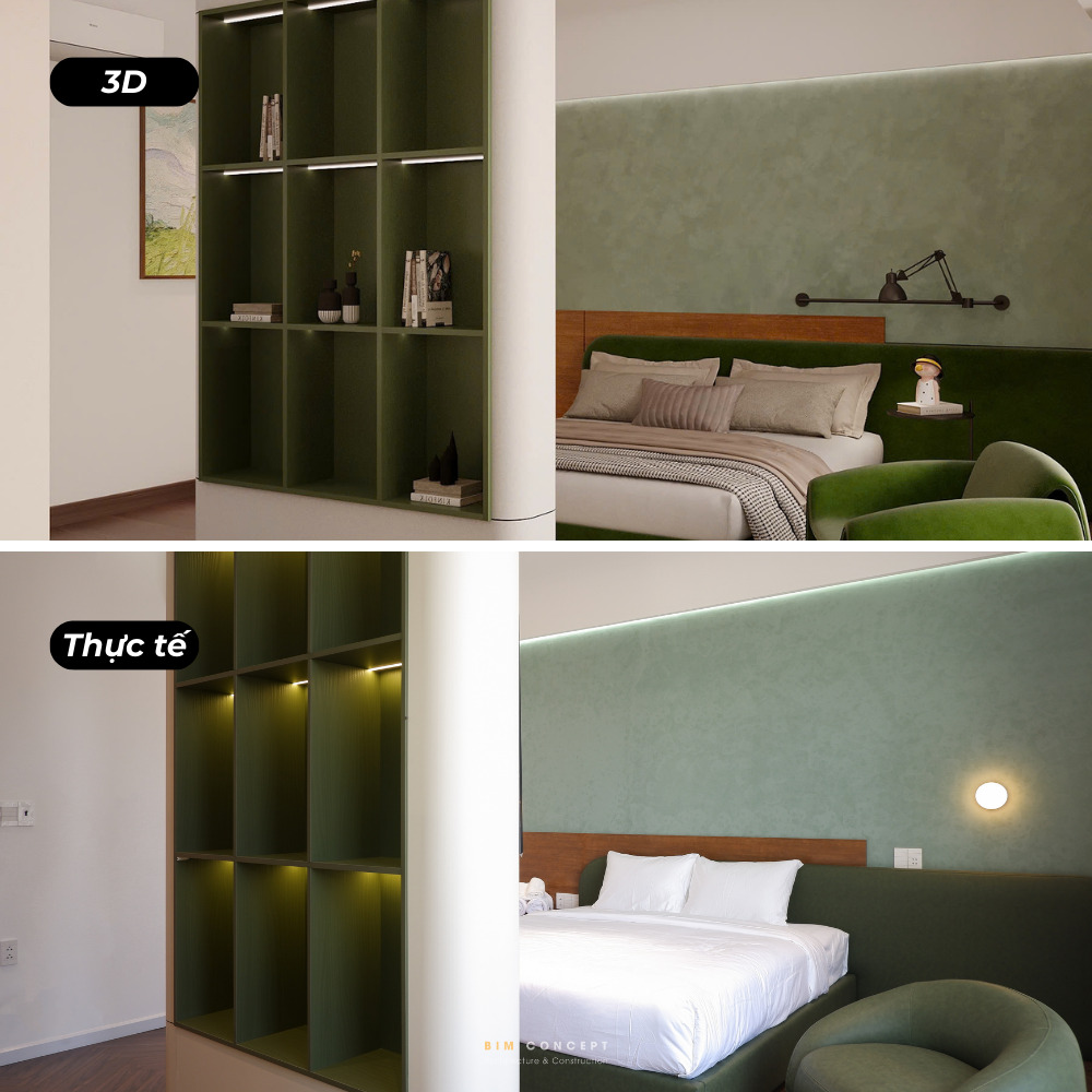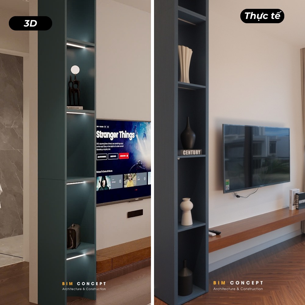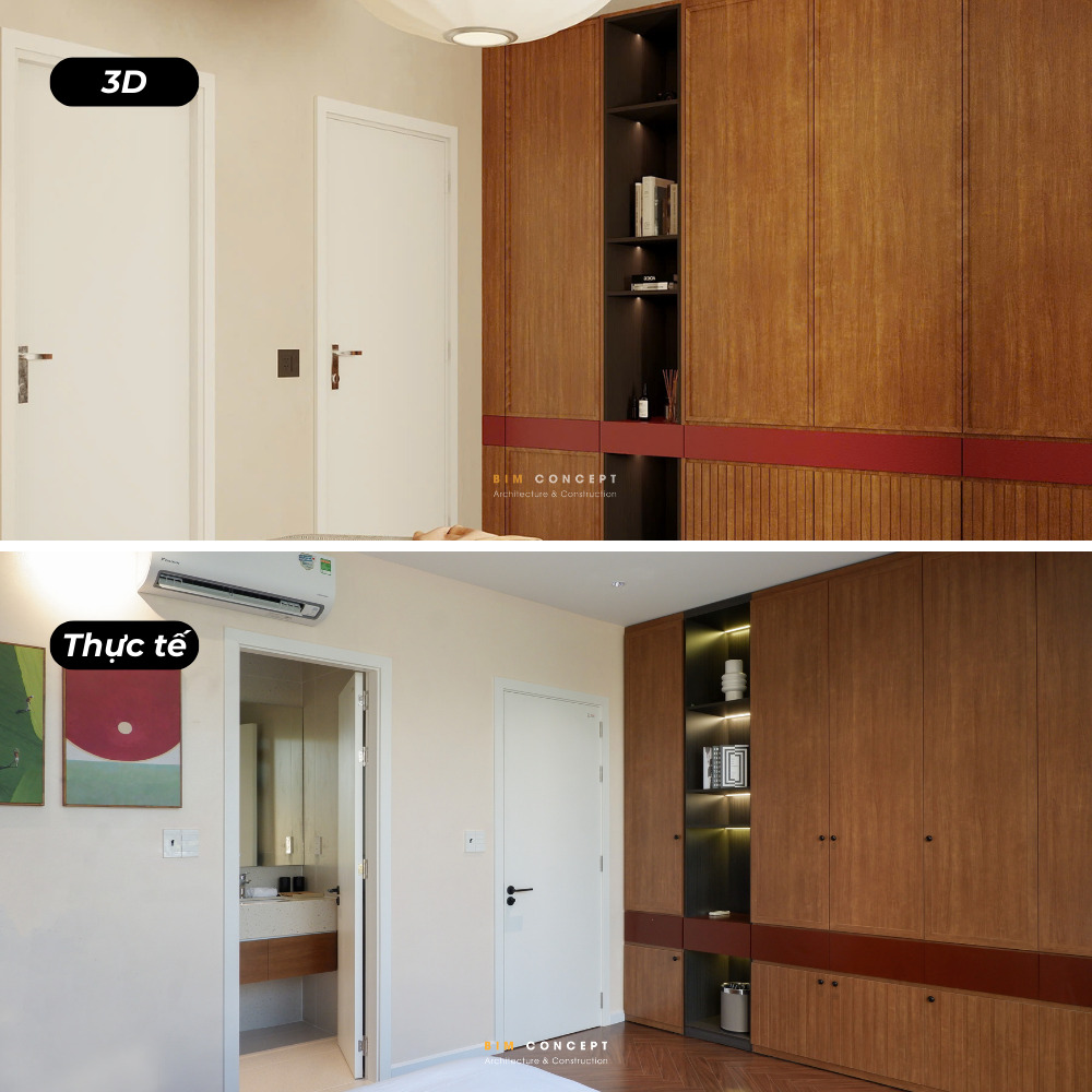 Để khách hàng có cái nhìn rõ ràng hơn về chất lượng thi công, Bim Concept luôn ghi lại hình ảnh thực tế sau khi hoàn thiện. Những bức ảnh này được đặt cạnh bản vẽ 3D để dễ dàng so sánh. Qua đó, khách hàng có thể thấy rõ mức độ giống nhau giữa thiết kế và công trình thực tế.